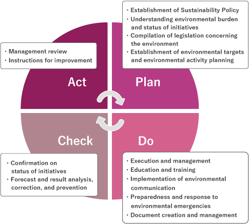 HHR and HHRAM have established and operate an EMS (Environmental Management System) based on the PDCA cycle, aiming to achieve sustainability goals and continuously improve environmental performance.Through the EMS, we strive to further reduce environmental impact andachieve environmental targets.