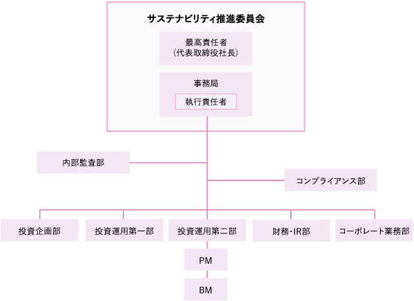 資産運用会社は「サステナビリティ方針」を実践するために、サステナビリティに係る各種ポリシーの制定、社内体制、外部の関係者との協働及び情報開示についての基本方針等について定めることを目的とした「サステナビリティ推進体制規程」を制定しました。その中でサステナビリティに関する意思決定プロセスとして「サステナビリティ推進委員会」を設置しています。